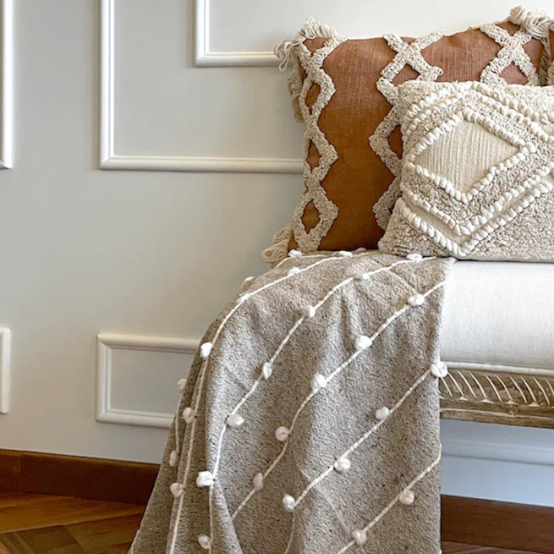 This neutral toned pillow is ideal to fill out busy corners of your home and add a serene touch of comfort. Each piece is handmade and therefore there may be slight variations. Insert included.