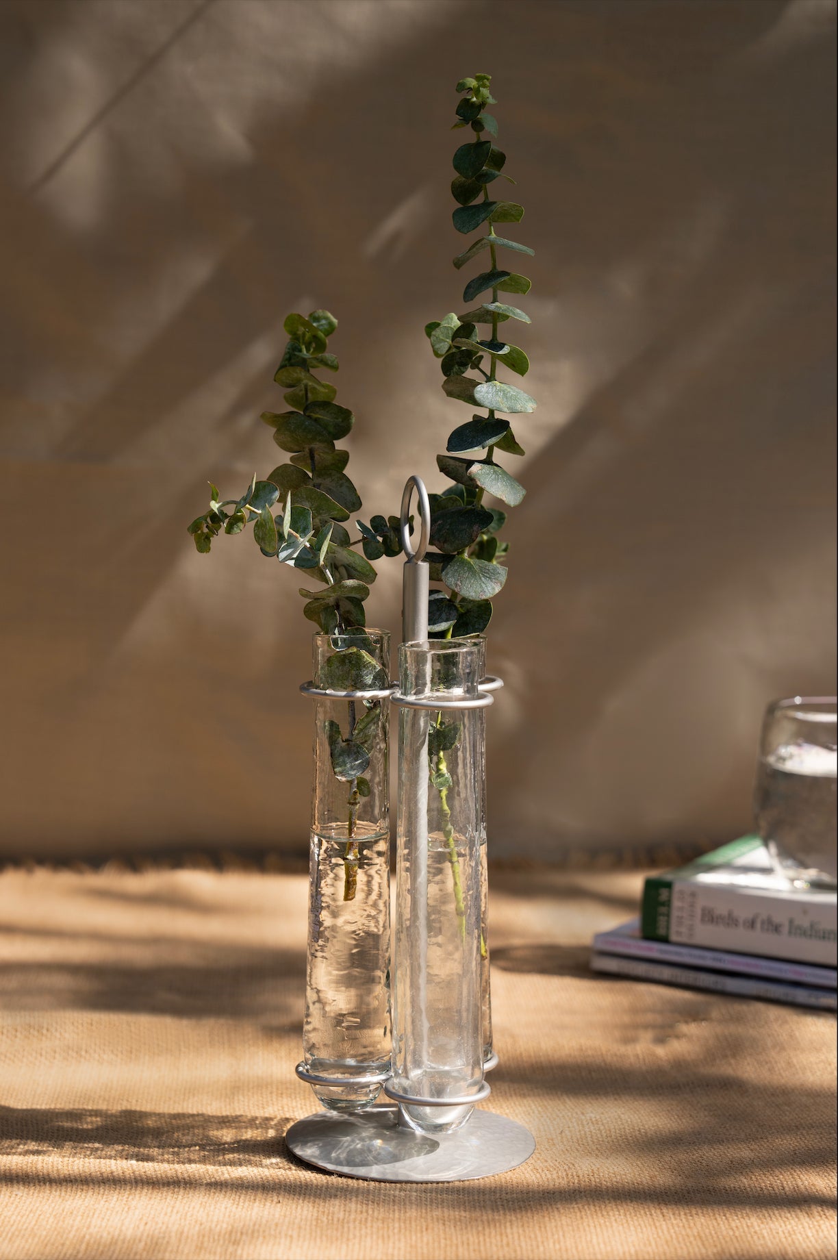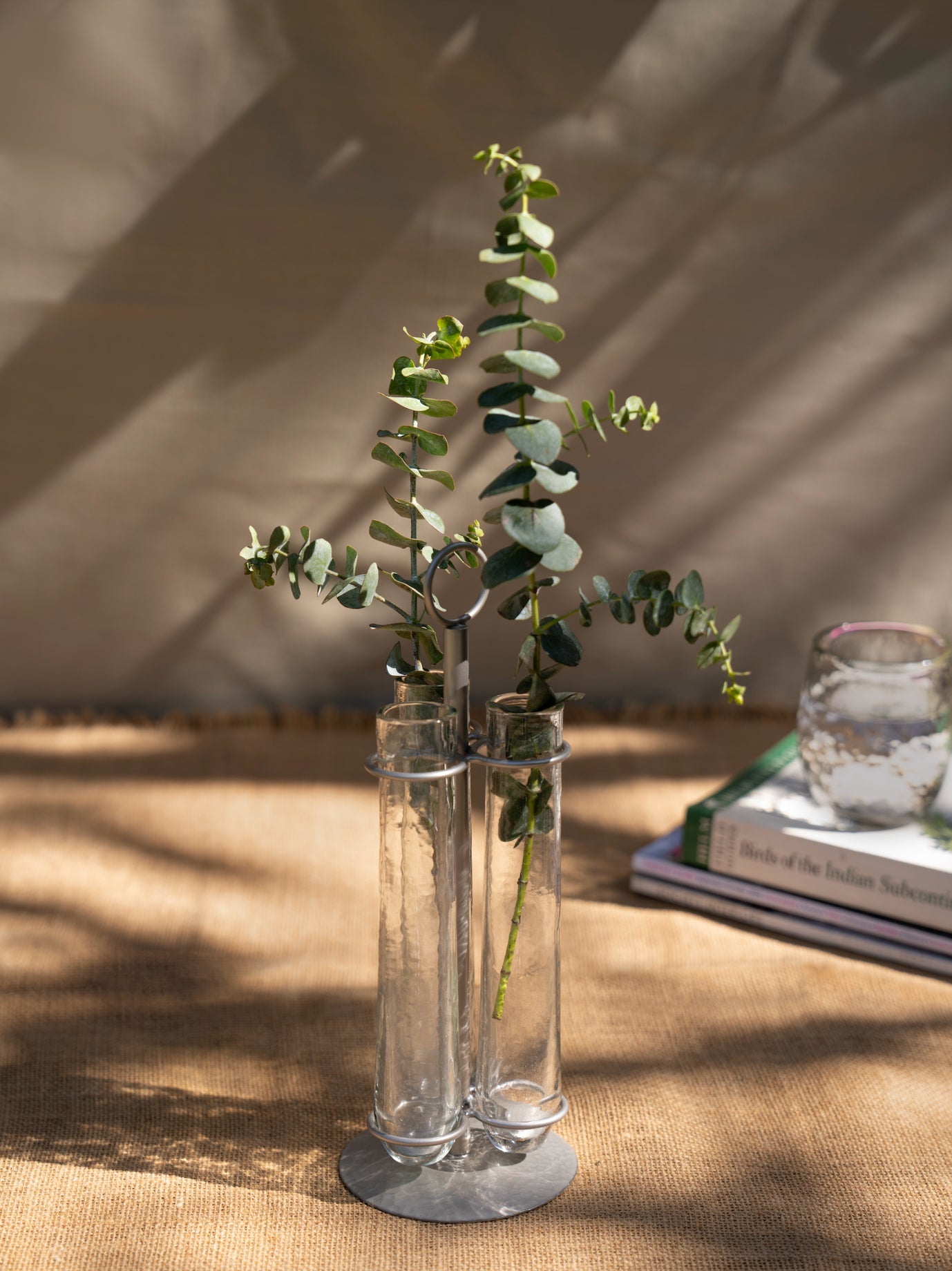 Elevate your floral arrangements with our Floral Trio Table Vase. Featuring three glasses for multiple stems, this vase is perfect for creating a stunning centerpiece. The hammered texture and pewter finish add a touch of elegance, while the ring handle allows for easy transportation. Upgrade your decor with this must-have vase.