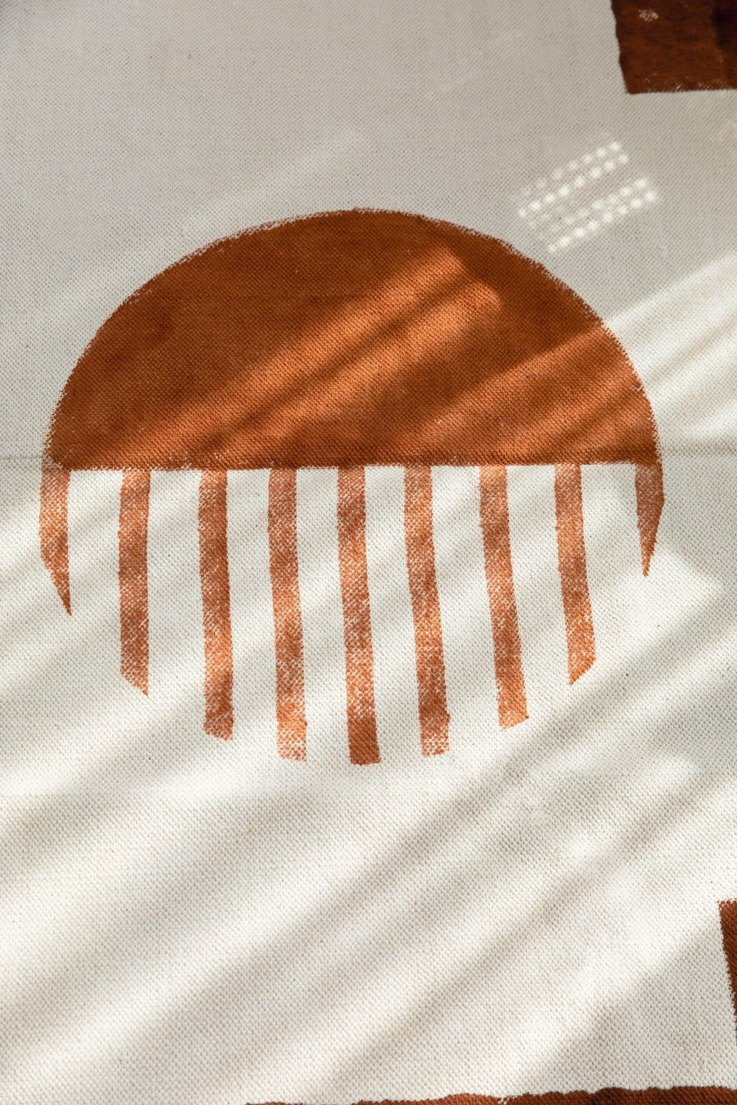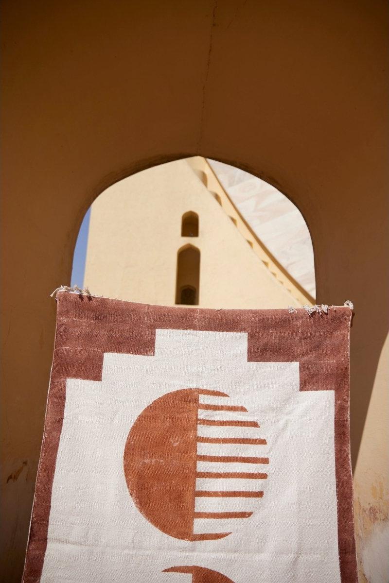 The design is hand-pressed onto each rug using hand-carved wooden blocks dipped in dyes. All rugs are made in small batches.