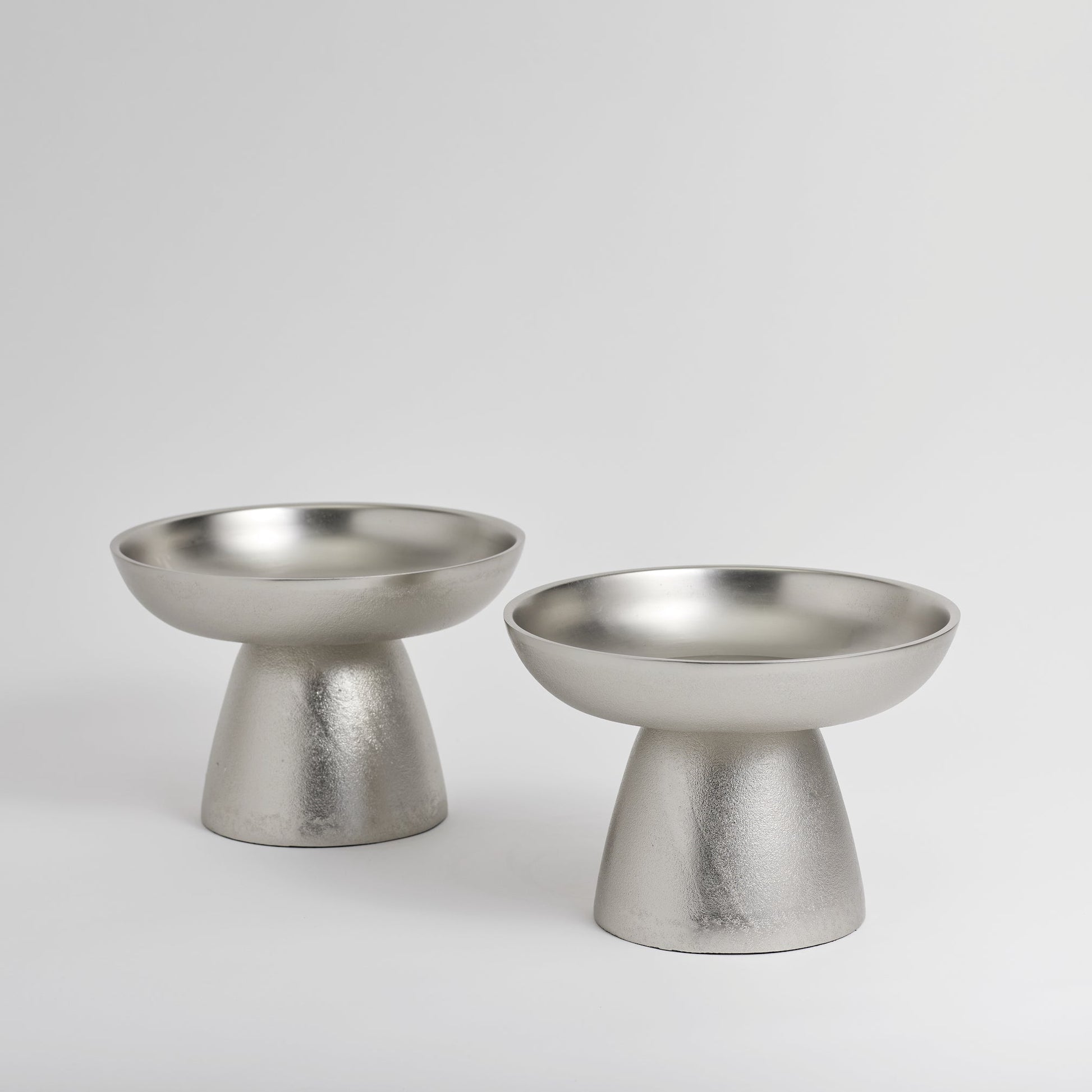 Our Stinson collection became more expansive this season, with the introduction of these modern, rounded Pedestal trays. Cast from lead-free aluminum, these substantial serving and display pieces feature a silver-like nickel finish that complements any decor. Their slightly cup-shaped tops flaunt a smooth serving surface, while their tall bases reveal some texture from their sand-cast origin. Set includes two small pedestals.