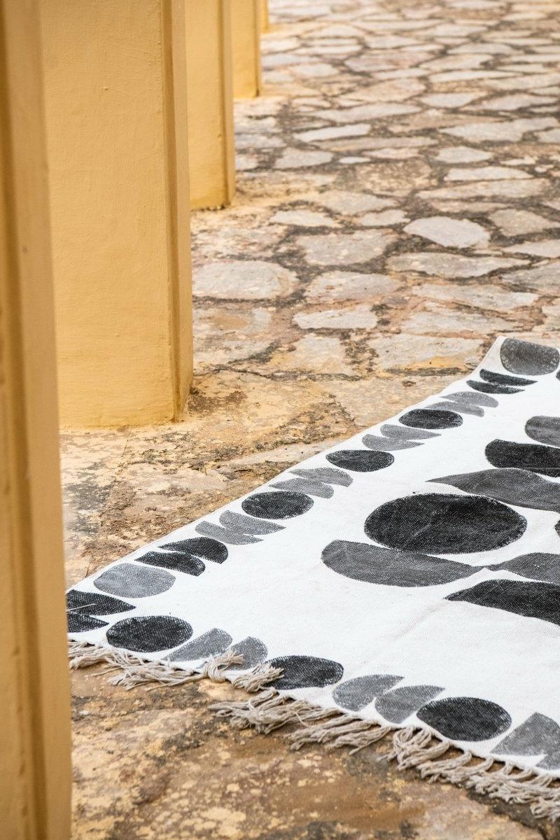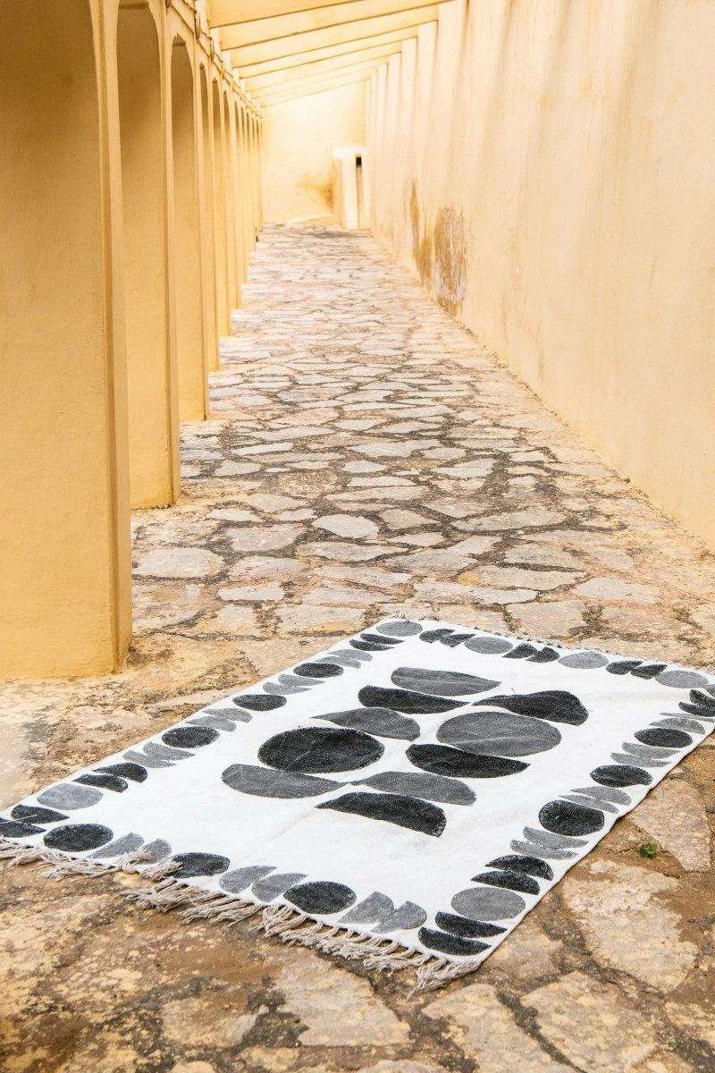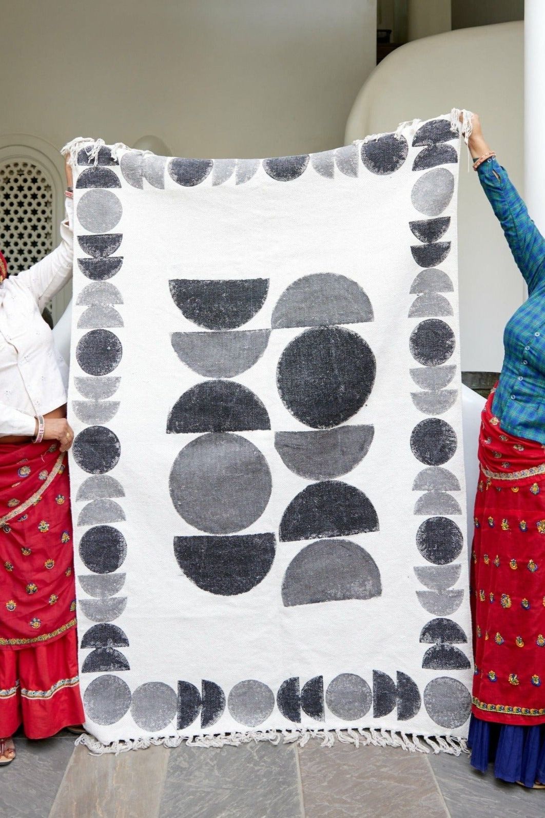 The design is hand-pressed onto each rug using hand-carved wooden blocks dipped in dyes. All rugs are made in small batches.