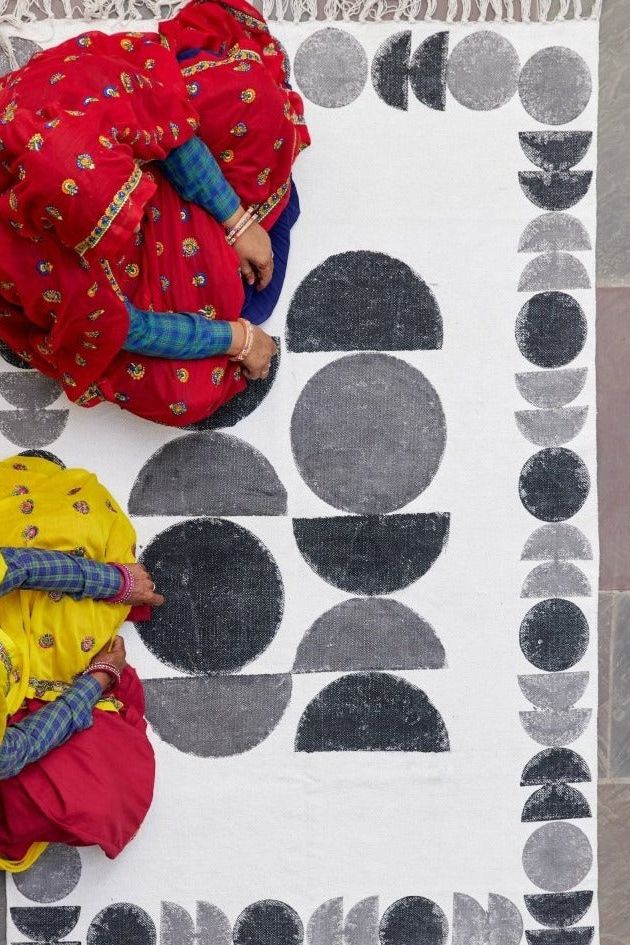 Each rug is handmade, requiring attention from 4 artisans, including wood carvers, block printers, weavers, and dye specialists.