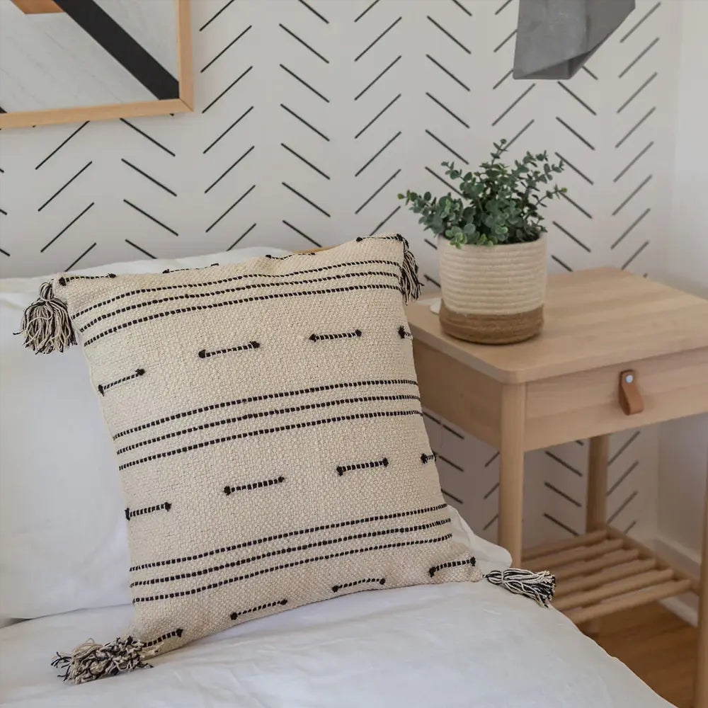 Intricate thread work making up a gorgeous weave and plush tassels on each side are a must add to your home. Available in shades of black and white, it can be paired with just about anything. Handmade by artisans, there might be natural variations making each one truly unique.